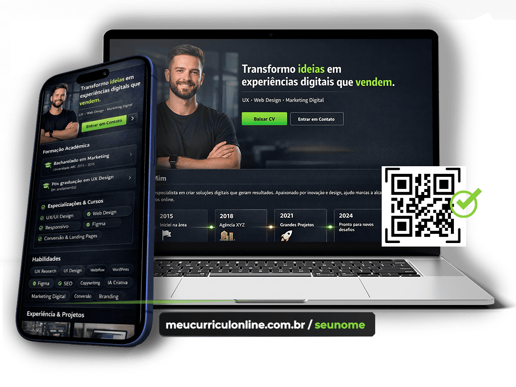 Página moderna estilo “site pessoal” com link próprio + QR Code para você mandar no WhatsApp, Instagram, LinkedIn e entrevistas.